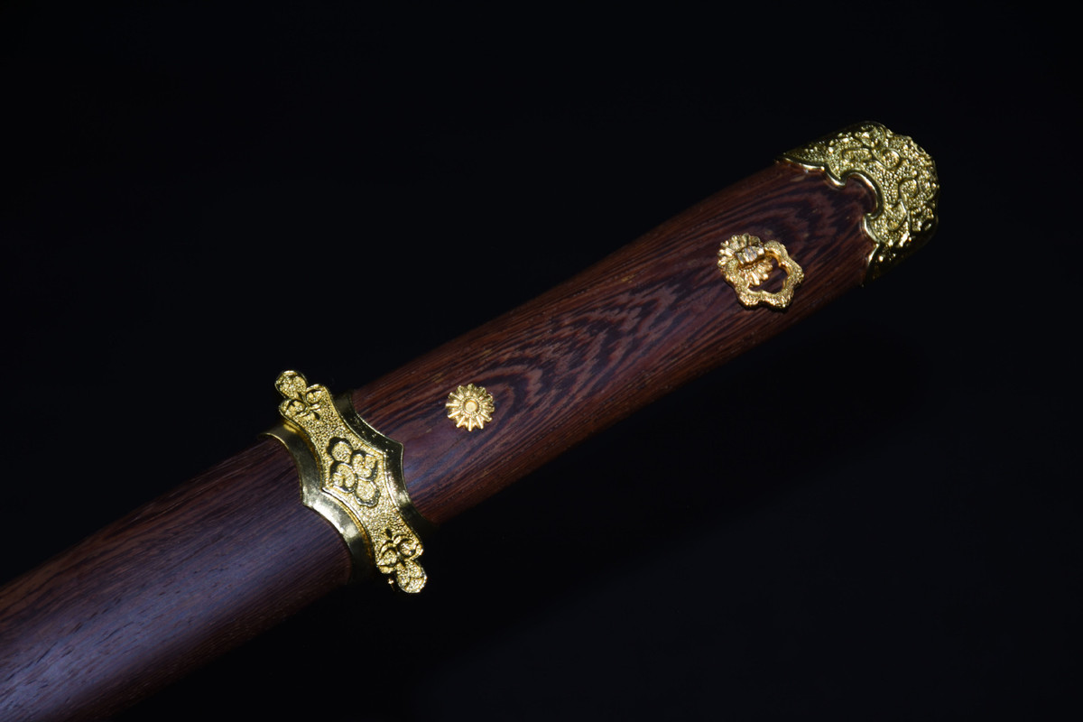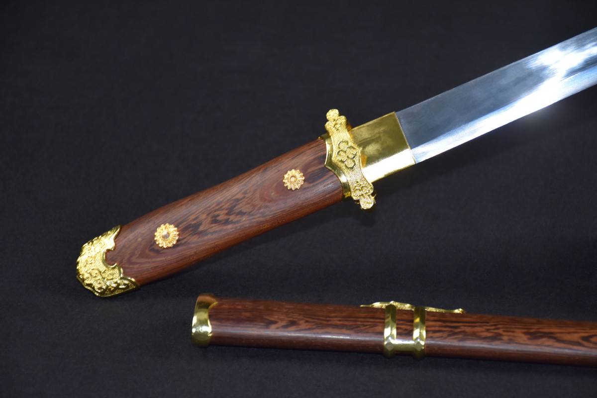 Short, simple design Total length: 54cm Blade length: 33cm Handle length: 17cm Blade width: 3.2cm Thickness: 0.6cm Blade material: High-manganese steel Sheath material: Rosewood Fittings: Alloy Net weight: 0.75kg Craftsmanship: Traditional forging, meticulously hammered and hand-polished