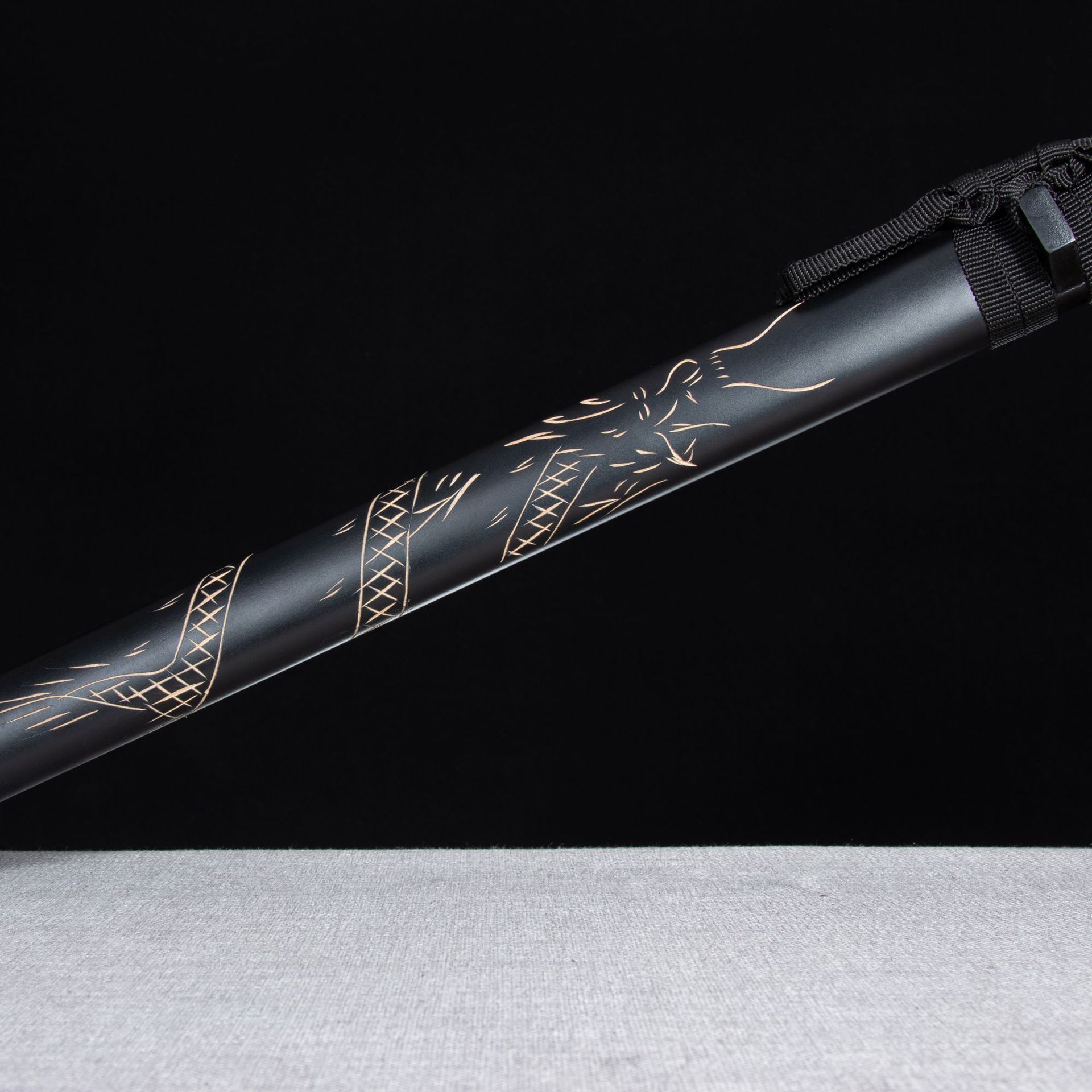 刃材:弹簧钢 鞘材:实木雕刻漆鞘