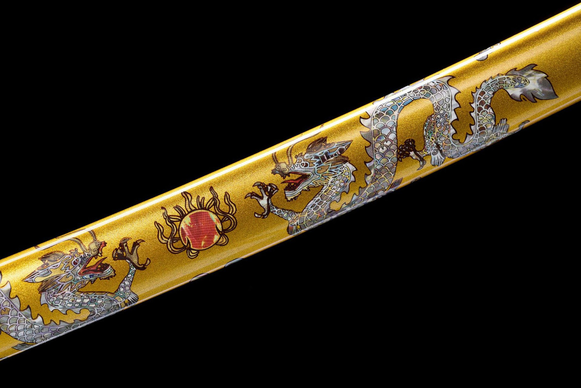 Medium carbon steel hand-slotted, 【Craftsmanship】Longquan ancient craftsmanship, hand-polished 12 times, 【Equipment】: Alloy + copper knife holder, 【Specifications】: Total length 103 cm, blade length 71 cm, handle length 26 cm, width 3.2 cm, thickness 0.7 cm 【Sheath】: Solid wood with dragon lacquer sheath