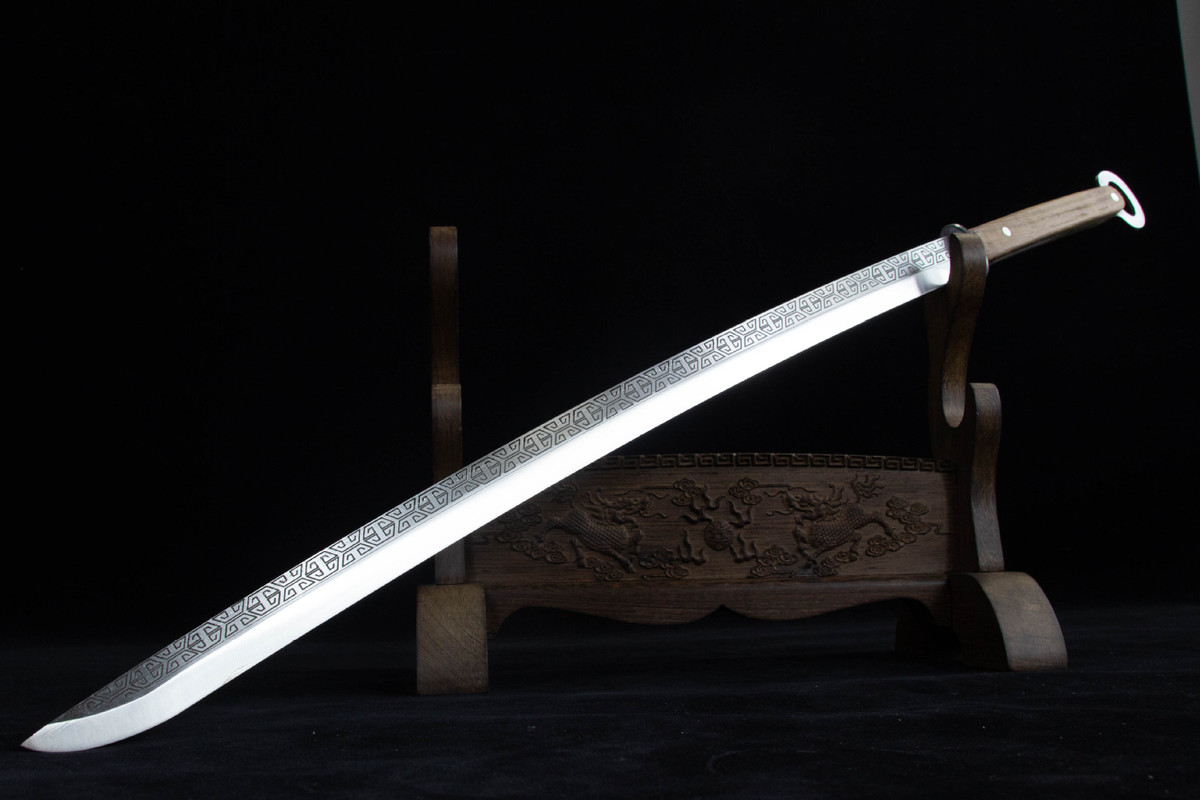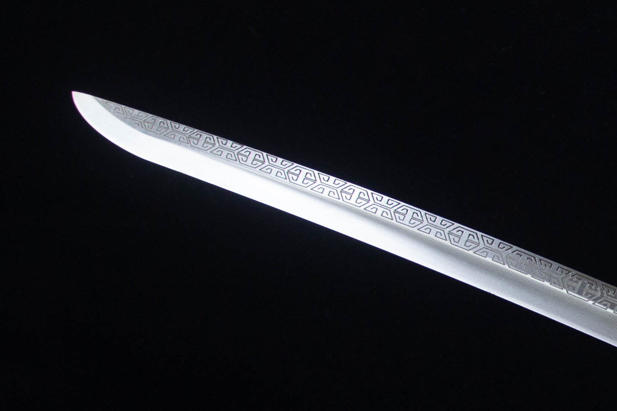 High-performance stainless steel Craftsmanship: Inheriting the traditional sword-making techniques of Longquan, hand-forged using traditional methods, and undergoes multiple processes including quenching, annealing, and tempering. Total length: 99cm Blade length: 66.6cm Handle length: 25.5cm Blade width: 3.2cm at widest point Thickness: 0.4cm Blade material: 7Cr17MOV (7% chromium, 17% molybdenum, vanadium steel) Handle material: 7Cr17MOV (7% chromium, 17% molybdenum, vanadium steel) + aluminum rivets + rosewood Weight: 1100g
