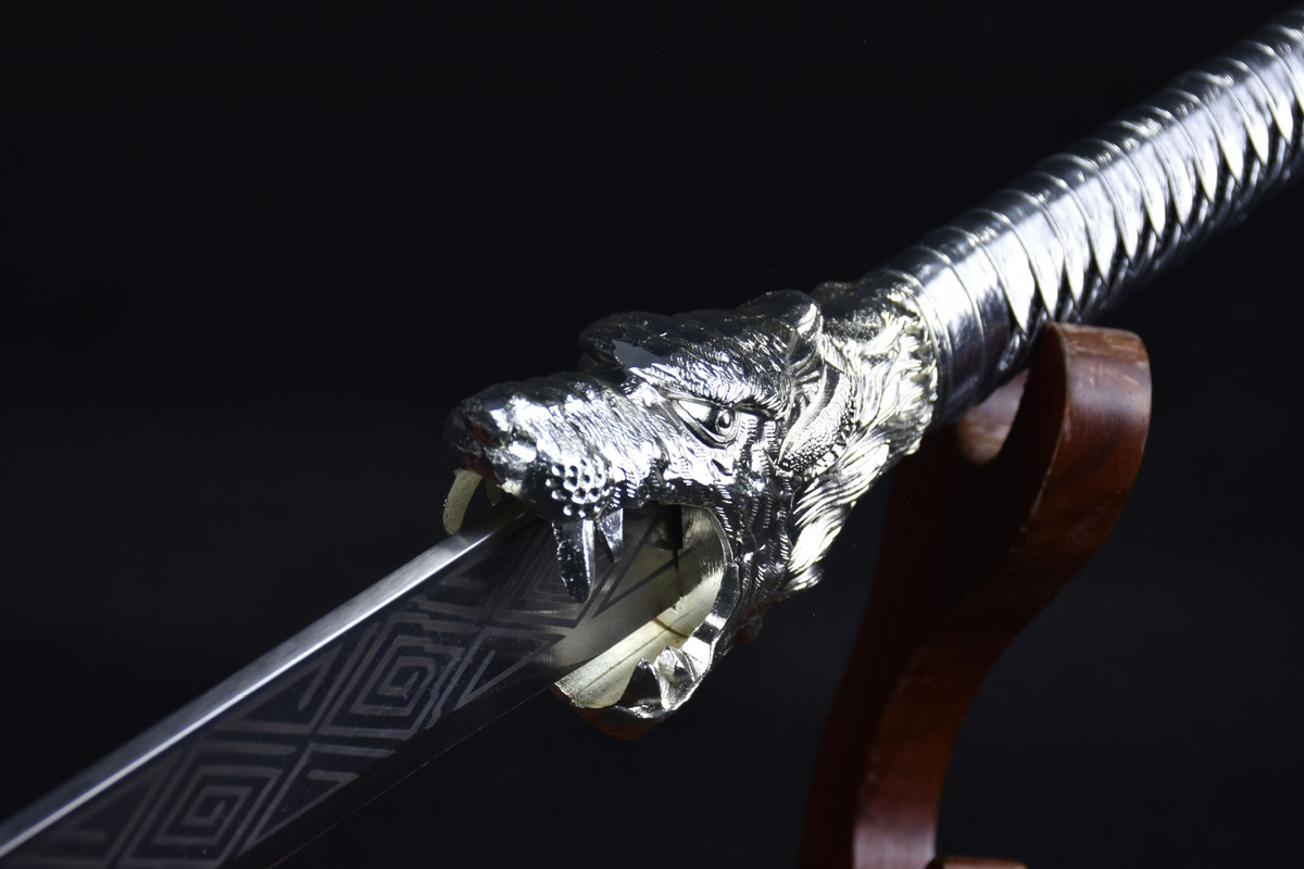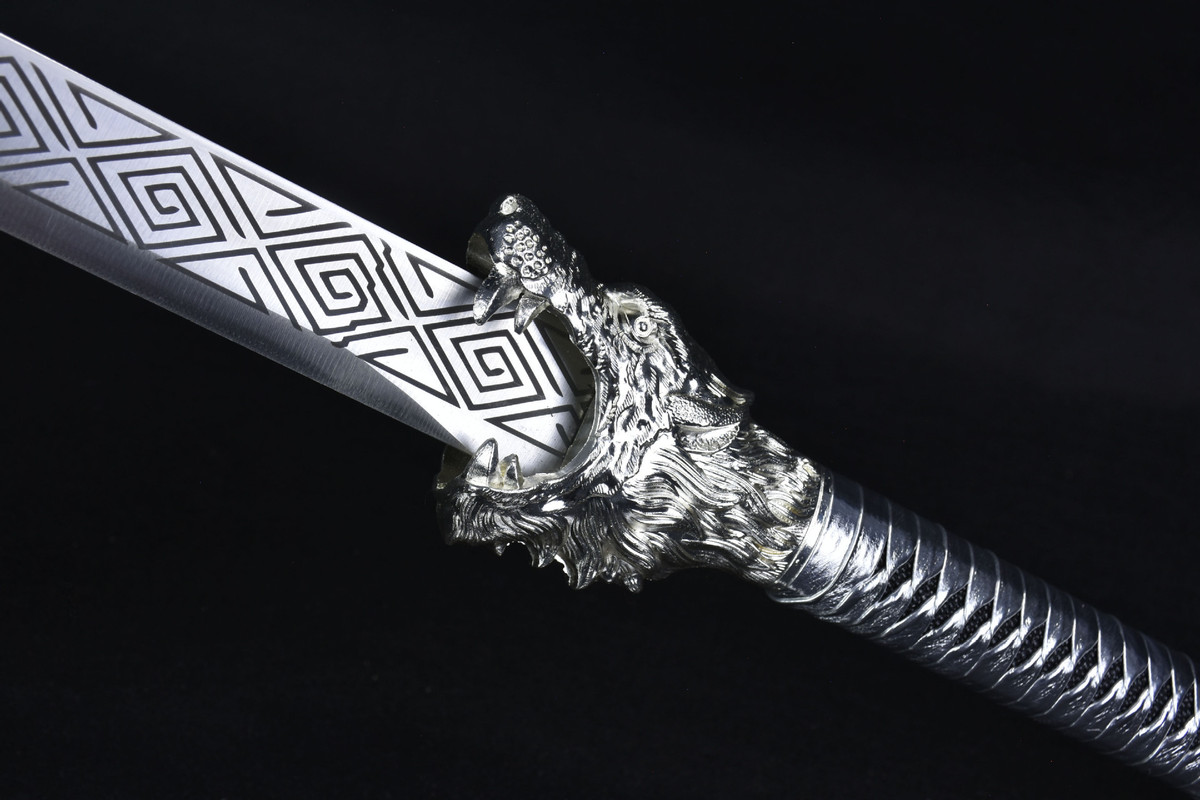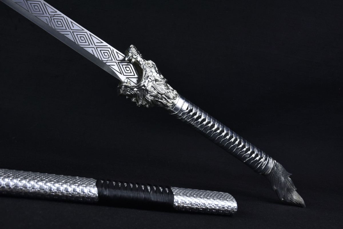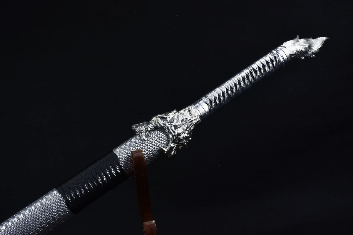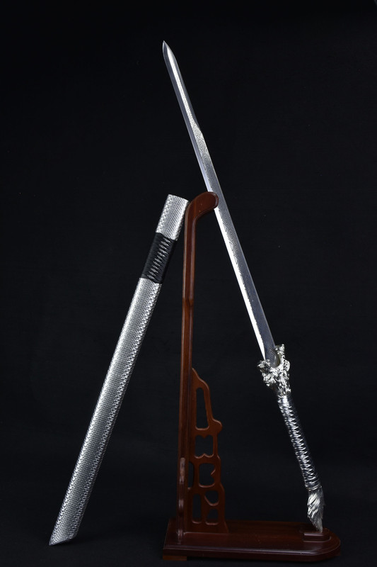 Silver Dragon Multi-Blade (Tang Sword) - High-Performance Stainless Steel Craftsmanship: Ancient forging techniques, hammered and refined, hand-polished Total length: 109 cm Blade length: 71 cm Handle Length: 30cm Blade Width: 3.6cm Thickness: 0.5cm Weight: Approximately 1810g (Sheath weight: 1384g) Blade Material: High-Performance Stainless Steel Sheath Material: PC-ABS Sheath Handle Material: PC-ABS + Anti-Slip Cord Accessories: Alloy
