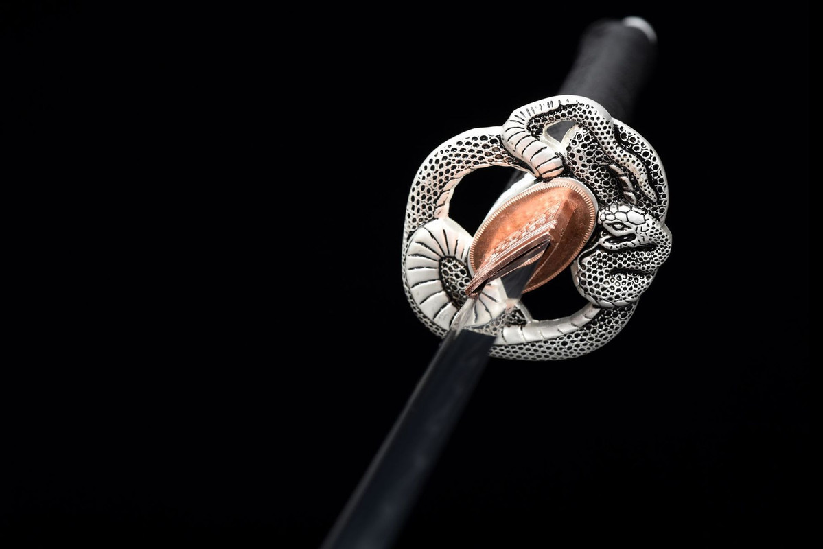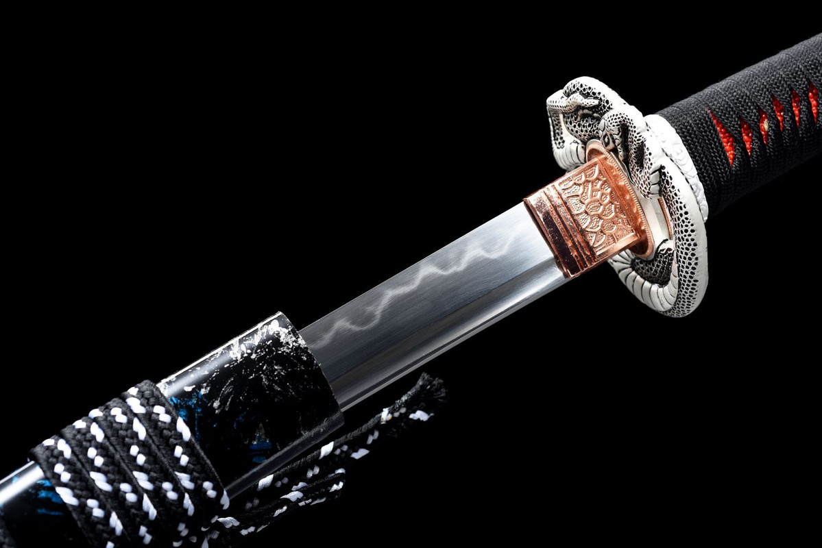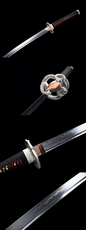 Silver Python Warrior; Total length 104 cm, blade length 71 cm. Handle length 26 cm, handle width 3.2 cm. Thickness 0.75 cm, weight approx. 1.35 kg. Blade material: covered with soil and fired. Sheath material: solid wood with lacquer finish. Accessories: alloy.